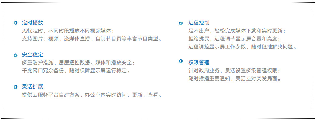 社区LED显示屏作为最贴近市民的窗口,拥有很高的公信力度,具备权威性、公益性等明显媒体优势。不仅可以实时滚动播放天气、城市应急突发预警、新闻资讯、公告通知、生活服务等社区资讯内容,为居民提供便利,还可以作为舆论引导的权威平台,帮助政府部门及街道办,完成法规政策、安全知识、疾病预防、科普教育、公益广告、精神文明建设等宣传工作。诺瓦智能LED云服务平台基于网络,能够远程控制和管理社区内各个屏幕的内容发布,随时更新屏幕内容,操作流程简单方便,播放内容安全可控,为构建和谐、平安的智慧社区提供有力保障。